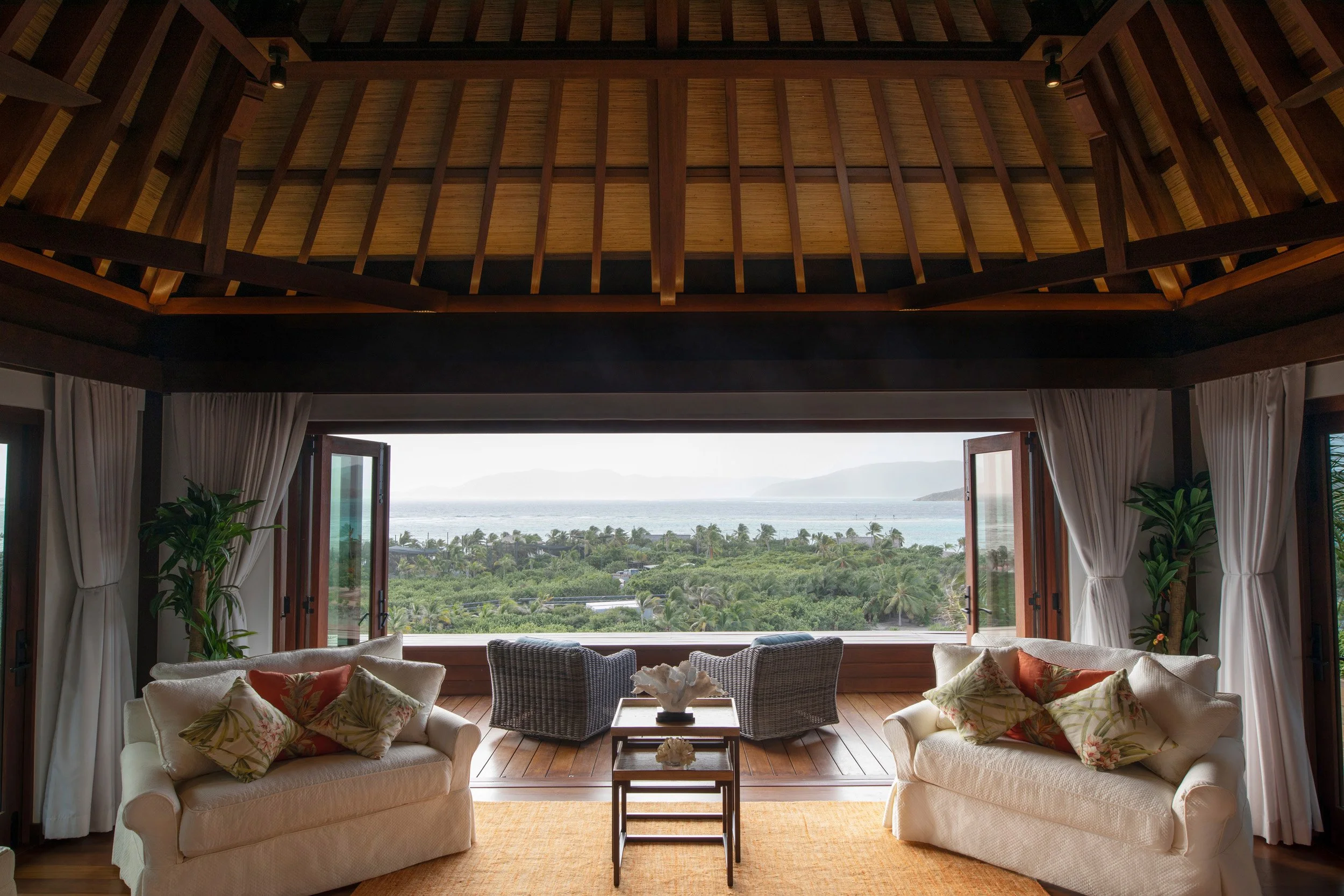 Dès que l’on pénètre dans le Great House, on est saisi par l’ouverture spectaculaire sur l’océan et les îles environnantes. Les baies vitrées laissent entrer la lumière des tropiques et offrent une vision infinie de l’horizon, où le ciel se confond avec la mer.
